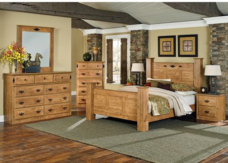 This distinctive bedroom set showcases a warm southern pine finish accented by rustic diamond-shaped details. Square-notch bedposts and cross-grain panels capture the rugged appeal of ranch styling, while hardwood and nylon center-guided drawers ensure lasting quality and smooth operation.